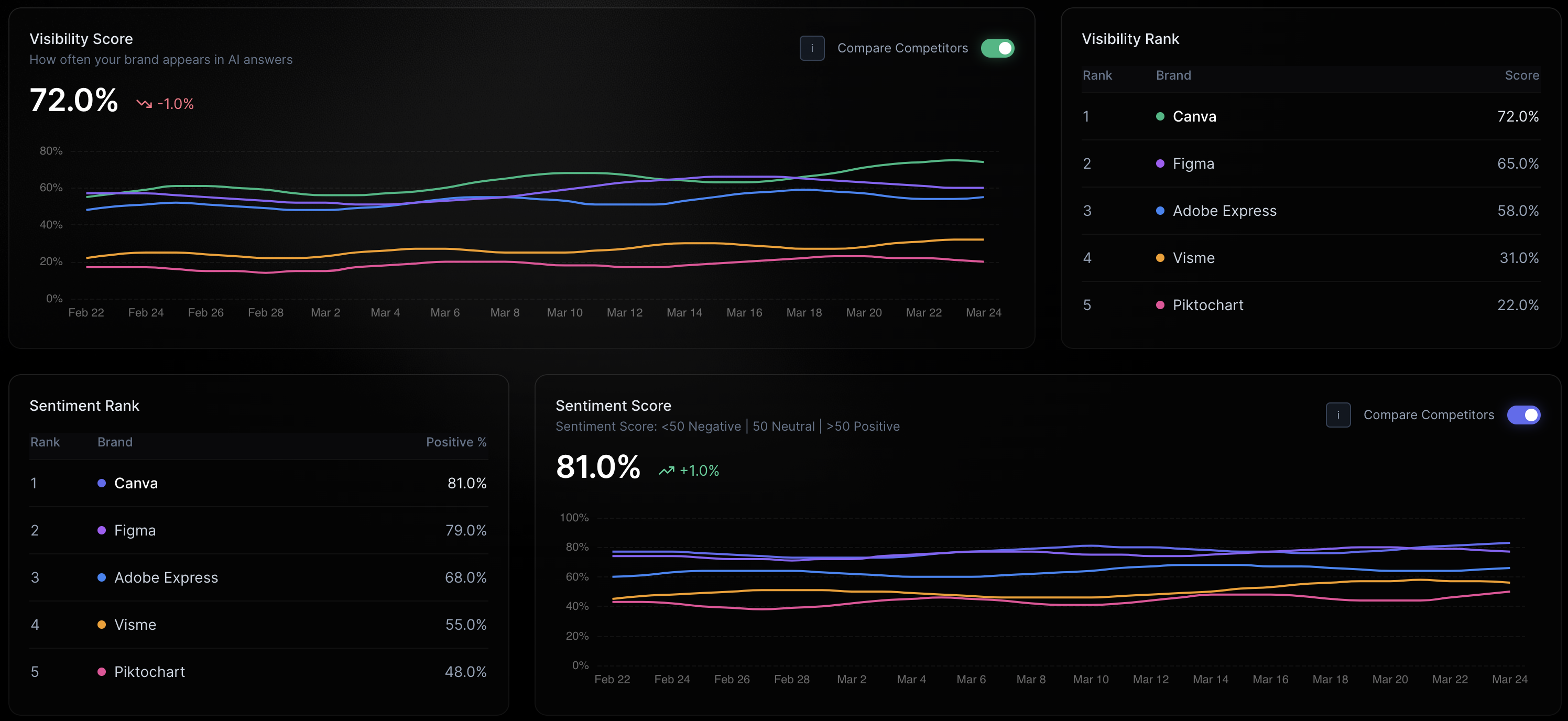 Compare your visibility score, average rank, and sentiment against competitors across the prompts, platforms, and markets you track.